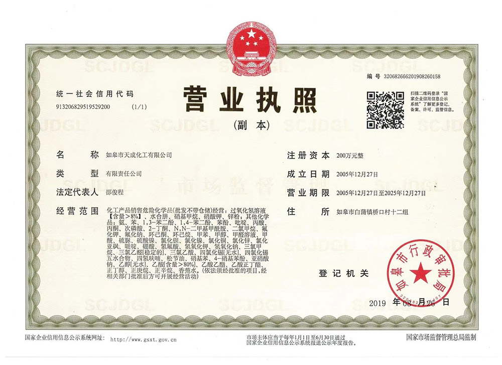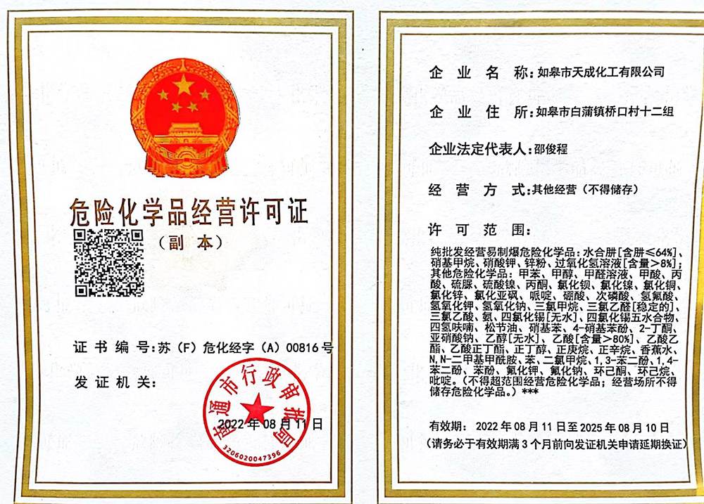 ? 如皋市天成化工有限公司創(chuàng)建于1996年。公司地處于美麗富饒的長江三角洲,座落在古鎮(zhèn)林梓,通揚(yáng)運(yùn)河河畔。南瀕長江、西臨204國道,距南通港、飛機(jī)場(chǎng)30公里,立體交通發(fā)達(dá)。公司經(jīng)營管理規(guī)范,技術(shù)力量雄厚,擁有一批高、中級(jí)專業(yè)技術(shù)人才。